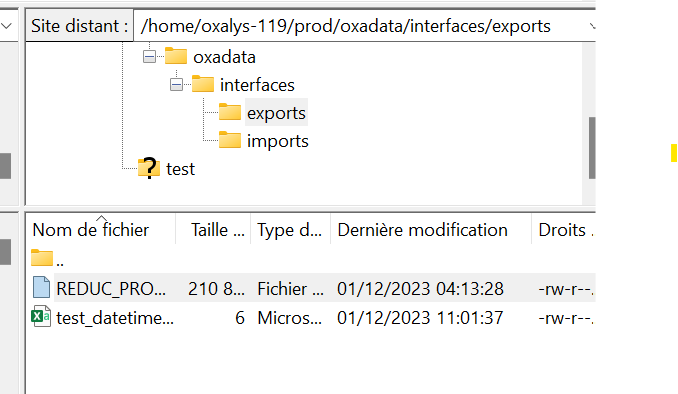 3) Se connecter avec FileZilla sur ce SFTP et aller sur home/oxalys-119/prod/oxadata/interface/export, et regarder la date du fichier "REDUC_PROD_77_OXADW.bak". Comme ici :